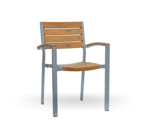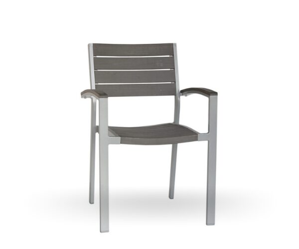 Anthracite aluminum frame armchair with synthetic teak slats in seat and back. Ergonomic, comfortable, resistant and stackable seating. Suitable for interiors and exteriors. Combinations: