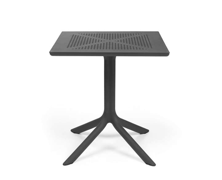 Plastic table Clip is designed to maximize space efficiency while delivering durability and modern style. This professional square table features a central column with four spokes and a DurelTOP tabletop distinguished by its subtle round perforated pattern. Crafted from uniformly colored fiberglass-reinforced polypropylene with UV additives, this plastic table is weather-resistant, lightweight, and ideal for outdoor hospitality environments. Finished in a matte texture with adjustable height feet for stability, Clip is easy to maintain and fully recyclable.